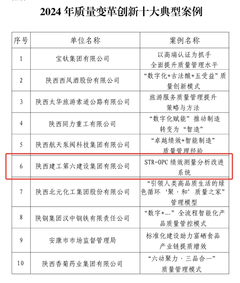 近日,陜西省市場(chǎng)監(jiān)督管理局發(fā)布“2024年質(zhì)量變革創(chuàng)新十大典型案例”,陜建六建集團(tuán)申報(bào)的“STR-OPC績(jī)效測(cè)量分析改進(jìn)系統(tǒng)”案例成功入選。